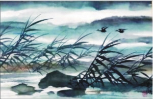 比如:图一的芦苇荡层次清晰,芦苇的杆叶笔笔带劲,笔下生风,并有强烈的节奏感和空间感,可惜锋芒毕露,尤其是最大的败笔在于两只飞鸟架不起这种营造过分的笔势压力,在飞行姿态上显得笨拙和别扭。