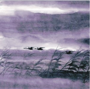 而图二的芦苇荡笔墨的处理上却能高水平地营造出一种特殊的戏剧性效果,虚实相生,烟雾弥漫,杆叶有深有浅,芦苇在衬托飞鸟中更是达到了形神兼备的境界。最大的亮点是把飞掠而过的芦雁,置身于一抹“天地极光”当中,显得黑白对比强烈,从而使命运寄寓逆风中的飞鸟身上,而让主题更加突出,在观赏中仿佛听到了音乐优美和舒展的主旋律和浑厚的副旋律混响的声音。图二是一幅对生命的礼赞和讴歌的作品,是艺术家命运的交响曲。