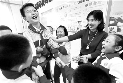 10月10日,河北省秦皇岛市海港区文化里小学开展心理减压体验活动,通过沙盘游戏、视听游戏等环节,让学生减轻心理压力。图为教师指导学生体验减压游戏。
