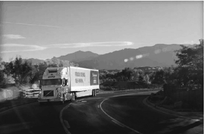 这辆沃尔沃的大型拖挂车装满了摄像头和传感器,它是Otto公司五辆测试车中的一员。从科林斯堡的称重站出发后,这个大家伙在没有任何人力介入的情况下跑了100英里。
