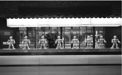 | 机器人在嘉宾报到台为嘉宾舞蹈 |
