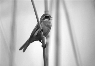 我寻找着芦苇间的缝隙,努力把焦距对在鸟的身上,功夫不负有心人,终于得到几张清晰的特写。阳光愈加明媚,我越战越勇,不断按下快门。忽然,手机不合时宜地响了起来,是个会议通知,总是这样,在我静心凝神地拍鸟时刻,出现讨厌的打扰。接完电话一看表,坏了,九点了,赶快收队!而这两只芦苇中的小鸟,绝地反击似地,也不再隐身茂密苇丛了,欢叫着,甚至站到了高高的芦苇枝头,那镜头感,甭提多强了,我瞠目结舌地望了望亮相的小鸟,美啊!可必须忍痛割爱,得上班啊!此时的心情就像儿时听过的芝麻开门的童话,进入藏宝之门,必须拿了便走,不可贪心,否则,大门就要关闭,别说宝物无收,连小命都会留下。当然,今天没那么邪乎,但我也不能耽误正事,何况已经得到几张清晰的鸟片,您就满意吧!