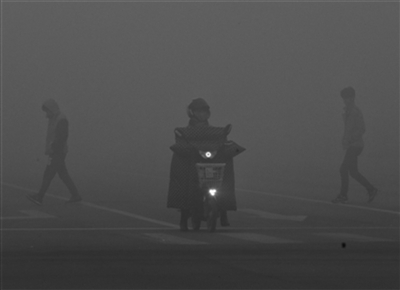 | 12月4日上午7时30分许,北京大兴区天宫院。路上的行人在雾霾中模糊不清。 尹亚飞 摄 |