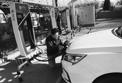 | 在京哈高速田家府服务区充电站,一名车主正在利用直流快充桩为自己的新能源车充电。摄影/ 方非 |