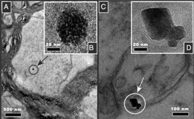 研究人员检测了37名(3岁-92岁)生活在墨西哥城(29名)和英国曼切斯特(8名)的参试者大脑额叶皮质,检测结果显示每克额叶皮质中含有数百万个磁铁矿纳米粒子。更为重要的是,这些磁性纳米粒子呈现两种不同的外形,一种外形有棱角,一种则是圆状,而圆状的粒子占了绝大多数,和有棱角的粒子比例是100:1。