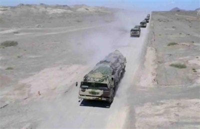 接下来在视频播放到50秒的时候,5枚东风-15A导弹从它们的发射车上升起。东风-15A是短程弹道导弹,射程只有560英里。较早版本的东风-15导弹的打击精度仅在900英尺(约为270米)范围内,而采用北斗导航系统的新版本则可以把精度提高到30英尺范围内。此类射程较短的导弹在打击印度边界地区以及台湾岛内的目标时将有用武之地。