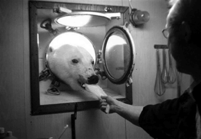 看到北极熊后,科学家们十分惊讶,但并没有用枪射击,而是给了它一大块生鱼片。