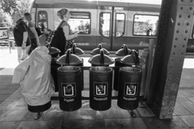 德国将生活垃圾大致分为不可回收垃圾、包装垃圾、纸质垃圾、生物垃圾、电子垃圾、玻璃垃圾等几类,它们的归宿是不同颜色的垃圾桶。