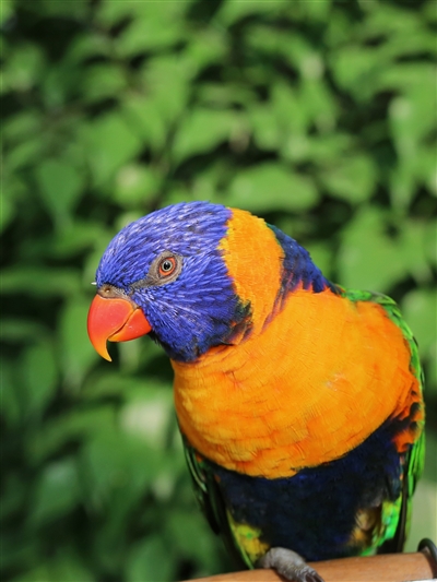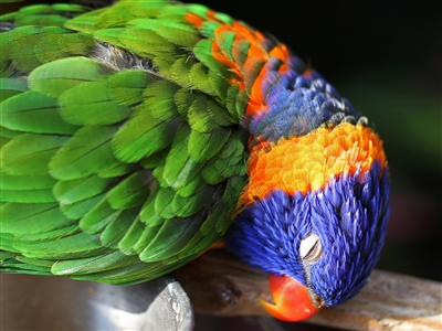 4月2日,北京南宫世界地热博览园的鹦鹉园内,红领彩虹吸蜜鹦鹉格外引人注目。一只鹦鹉精神抖擞地面对欣赏它的一众游客(右),另一只鹦鹉则在撒满阳光的地方睡觉(左)。