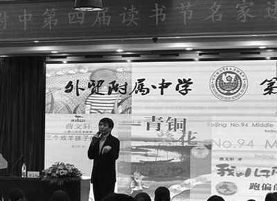 4月13日,著名作家曹文轩走进外经贸附中,给学生们上了一堂生动的“阅读与写作”课。曹老师用“三个放羊孩子的故事”告诉学生们写好作文的必胜要素是:人生财富+想象力+阅读。