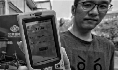4月13日,天天洁再生资源的员工展示垃圾回收员携带的垃圾回收预约移动终端。