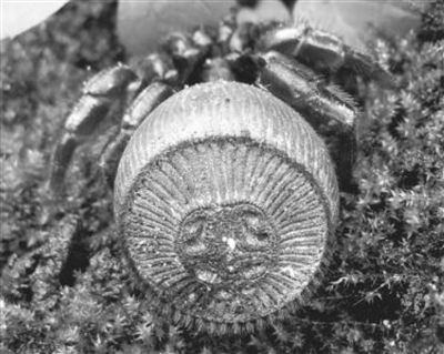 这种珍稀的蜘蛛形态怪异,身体后部平截如磨盘状,上面还有精致花纹,看上去像一枚古钱或是印章。