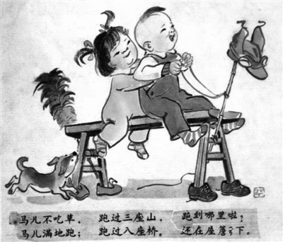 张乐平的作品《骑马》描绘了两个孩童拿长板凳当马儿骑的场景,长凳前头装个马儿的面具,后头有小狗在追逐,两个孩童笑的睁不开眼。画上的配字“马儿满地跑,跑过八座桥,马儿在哪里,还在屋檐下”,再现了孩提时代自娱自乐的场景,童趣十足。