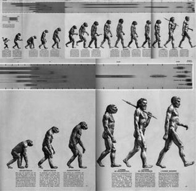 图中最左侧画的就是猿猴,最右侧是我们现代人。这让我们从本能上认为,人类的进化就是从猿猴开始的,经过中间一个接一个的进化阶段,最终变成了现代人。