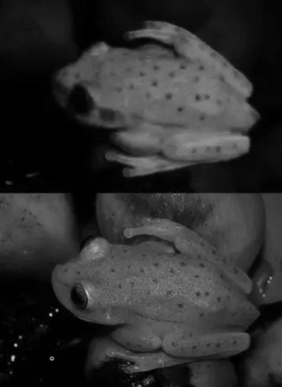 在正常光线照射下,南美洲圆点树蛙会像调色板一样显现出柔和的绿色、黄色和红色。然而一旦调暗光线并打开紫外线光照后,这种小型两栖动物便会发出明亮的蓝色和绿色光泽。这种吸收短波长光线并在较长波长上再次发射的能力被称为荧光性,其在陆生动物中非常罕見。迄今为止,在两栖动物中更是闻所未闻。 新浪科技 编译/刘芳宇