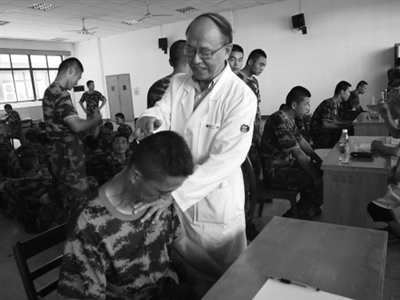在建军90周年来临之际,浙江省科普作协医学专业委员会组织17位医学专家和工作人员,冒着40多度高温到武警部队驻杭某部开展科普医疗咨询活动。这也是医学专业委员会连续19年在“八一”前夕到部队慰问。这些科普作家都是具有高级技术职称的医疗专家,他们中年龄最长的已经超过80岁。