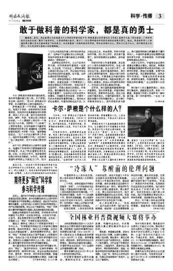 萨根一生出版了大量科普文章和书籍,被称为“大众天文学家”和“公众科学家”。主要科普作品包括《超时空接触》、《宇宙》、《布卢卡的脑》、《被遗忘前辈的阴影》、《黯淡蓝点》、《数以十亿计的星球》等。他主持过电视科学节目,《宇宙》系列电视节目在全世界引起热烈反响,《伊甸园的飞龙》获美国新闻界最高荣誉普利策奖。