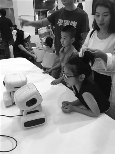 | 图为孩子们爱不释手的与派宝机器人T2互动。 李苹摄 |