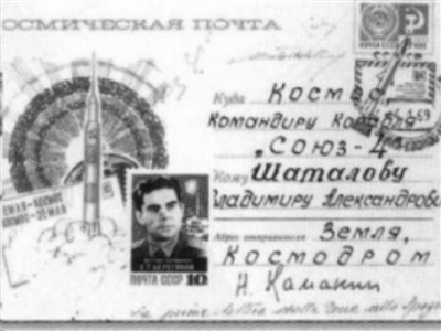 苏联太空邮局从此诞生。今天,第一封到过太空的信件早已成为稀有珍品,堪与世界上最贵的邮票相比。为了纪念首次“宇宙投递”还为航空邮政发行了为数不多的纪念封,上面画有正在对接的宇宙飞船和文字说明“太空邮局”。但是这枚信封未能进入太空。俄罗斯之声2017.8.31