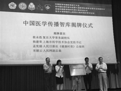8月31日,在中国科普作家协会医学科普专委会换届会议上,国内首个 “中国医学传播智库”成立。该智库将集中国内权威的医学家、科普作家和媒体人,来共同干预引导我国的健康科普工作,期待形成新的医学传播学术理论。复旦大学常务副校长桂永浩,上海市科协党组书记杨建荣、人民日报社《健康时报》总编辑孟宪励和人民网副总裁宋丽云共同为智库揭牌,宣告启动中国医学科普事业的一个里程碑。