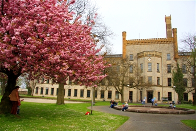 走出缝纫机博物馆,不知不觉中我又来到拉文斯贝格公园。随着纺纱厂逐渐退出历史舞台,老纺纱厂主楼前,1978年为纪念比勒费尔德市与英国罗奇代尔市建立城市伙伴关系25周年而建立的罗奇代尔公园花木繁茂,两棵巨大的樱花树开花时节像是两朵祥云,萦绕在端庄宁静的老厂房前。