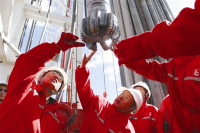 图为该公司技术攻关小组在羌参1井判断分析钻头使用情况。通讯员 陈英杰 摄