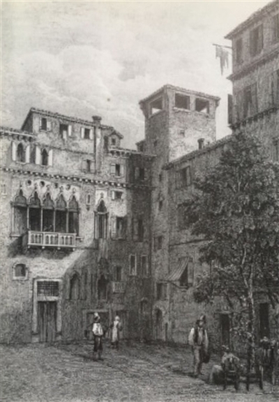 Pauthier 收录的马可·波罗在威尼斯的住宅。事实上Pauthier弄错了,因为那时这位伟大旅行家的故宅早已不存在了。(见所著《马可波罗的生活》一书的封面,作品为钢雕)