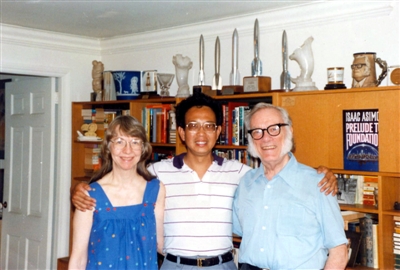 | 1988年8月13日,卞毓麟在纽约阿西莫夫家做客时与主人夫妇合影。 |
