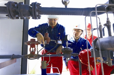 技术人员现场查看橇装设备运行流程。通讯员 刘 伟 摄