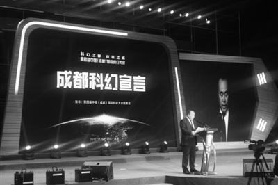 | 第一届中国科幻小说银河奖金奖得主、四川省科协副主席、四川省科普作家协会理事长吴显奎代表大会组委会发布《成都科幻宣言》。 尹传红 摄 |
