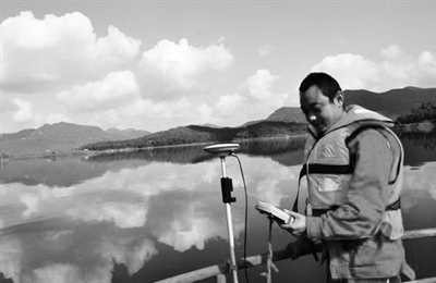 图为测量人员精测每道水下检波点数据。