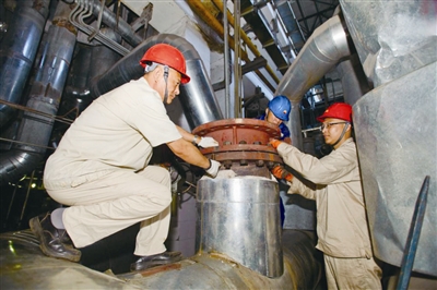 图为该分厂汽机管阀班老师傅“手把手”帮带班组青年员工。