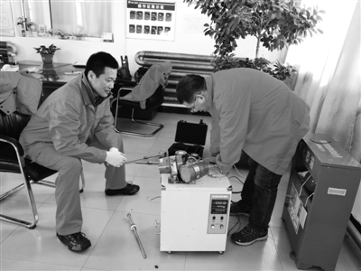 图为储运销售分公司研究所仪表室人员在南三油库现场检定温度变送器。通讯员 杜新东 摄影报道