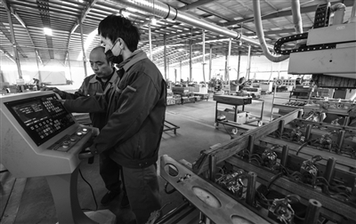 12月11日,河北省饶阳县昊阳红木雕刻产业园工人在用新引进的八轴榫槽机加工红木家具榫槽。