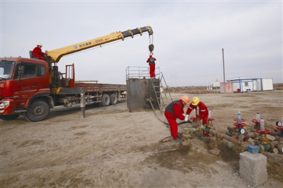 图为因TH10118井口压力过高,员工在用软管连接过渡罐与TH10118井井口,准备用过渡罐和泵车往井内注入稀油。通讯员 胡 强 摄影报道