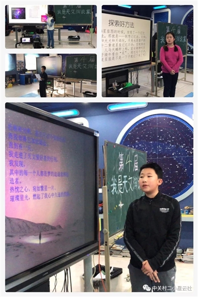 12月中旬,北京中关村二小星云社第四届天文演说家活动热闹开讲。比赛中,同学们总结了学习天文的方法:多阅读天文知识、查阅天文资料、做天文笔记;表达了参加天文观测的感受,锻炼了自己的实际操作能力,在探索宇宙奥妙的同时,学会了持之以恒、团结互助。