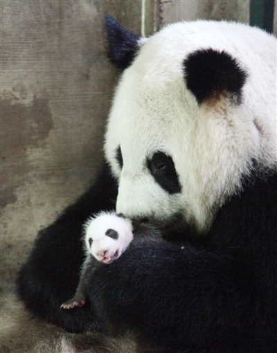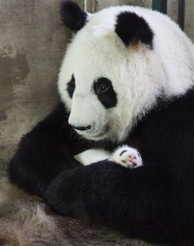 | 熊猫妈妈产崽后,有数日不吃不喝,将幼崽抱在怀中。由于幼崽生下来平均体重只有100多克,相当于妈妈体重的千分之一,一不小心就可能压着娃娃。所以,“坐月子”的熊猫妈妈日日夜夜,分分秒秒不得安宁。 周孟棋 摄 (详细报道见本版文章《那一双疲惫而忧郁的眼睛》) |