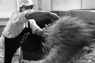 在贵州省赤水市一带,至今流传着一种传统古法制醋工艺——赤水晒醋。这种古法酿醋技艺以当地优质大米、糯米、纯中药制作醋曲,经过蒸煮、酿晒、发酵等30余道工序制作而成,具有色泽柔和、酸香爽口等特点。近年来,当地政府加大宣传和保护力度,使这种古法酿醋技艺得以保护和传承。图为贵州赤水晒醋传承人在手工翻动酿醋用的醅。 新华社发(王长育 摄)
