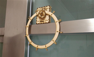 第三步:组装调试你的“齿轮时钟”。将切割好的部件从激光切割机上取下组装起来。将分针齿轮套在表芯分针转轴上,再把O形的时针齿轮挂在分针齿轮外侧,给表芯装上电池,将分针齿轮和时针齿轮分别对准0分和12点,然后旋转表芯后面的调整旋钮,对到现在的时间即可。