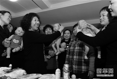 1月20日,石家庄市千惠母婴护理培训中心免费为200多名下岗失业妇女举办为期一周的月嫂培训班,专业老师现场讲解小儿推拿、产妇护理、制作月子餐等方面的技能。 新华社发(张 震 摄)