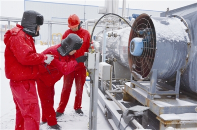 | 长庆采气二厂神木天然气处理厂员工正在检测凝析油稳定撬风机故障 |
