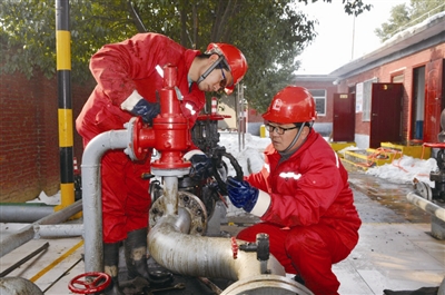 1月30日上午,在河南油田采油一厂下二门采油管理区18号计量站泵房,站长宫胜利(右1)和职工徐孝辉正在更换油气混输泵出口单流阀法兰垫片。