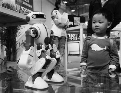 4月20日,由中国科协、安徽省人民政府主办,安徽省科协、芜湖市人民政府承办的第八届中国(芜湖)科普产品博览交易会在芜湖国际会展中心举行。本届科博会以“科普+科技”的方式,集中展示我国近年来取得的科技成就、最新科普产品和技术。图为科博会上的小朋友与会跳舞的机器人在一起。 石轩 摄