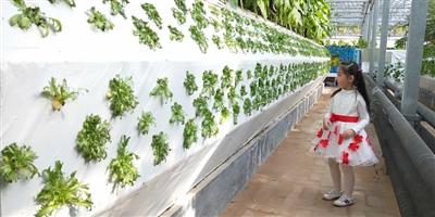 展会的绿色胜境、蔬菜奇观、农业技术等也吸引了小朋友们求知的兴趣。气雾栽培是一种利用喷雾装置将营养液雾化,直接喷洒到植物根系以提供植物生长所需的水分和养分的水耕栽培方式。能节水、节肥,没有任何土壤或其他污染所致的污垢发生。图为于梦溪小朋友在观赏用气雾技术栽培的绿色植物。