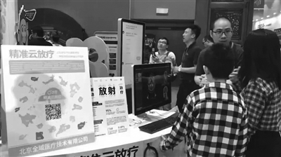 5月19日,北京全域医疗技术有限公司携“放疗移动医生”、“精准云放疗”、自动靶区勾画、自动计划设计系统等产品于2018年全国科技活动周暨北京科技周活动主场,“科技创新加速度”展区参展,为科技创新“加速度”。图为,全域医疗工作人员为参观群众详细讲解放疗“黑科技”和ARPlanner自动靶区勾画系统。 朱晓华 摄