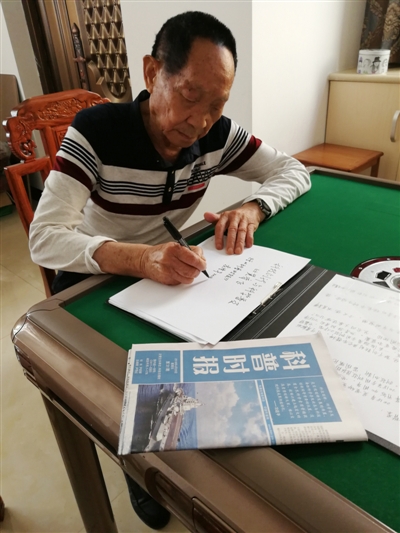 我特别把新出的一期《科普时报》呈递给袁老,并请他谈谈对科普的看法。他说,科普很重要啊,老百姓借助科普了解更多的科学知识,提高文化水平,不做“科盲”,就不会陷于迷信,也不容易上当受骗。