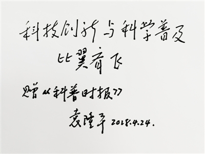 我请袁老为《科普时报》写几个字,他欣然应允,写下:“科技创新与科学普及比翼齐飞 赠《科普时报》”,并签上了自己的名字。
