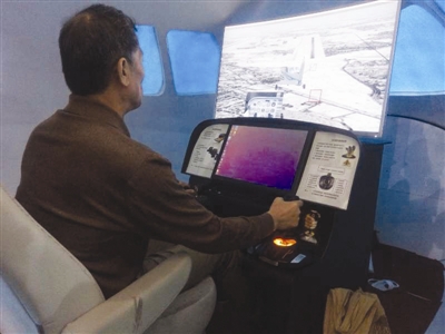 科技周上展出的模拟北斗卫星导航飞行校验系统,图为参观者在模拟驾驶飞机。 张爱华 摄