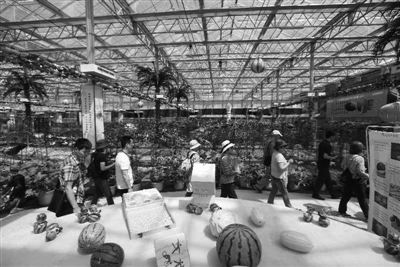 在庞各庄御瓜园,冯乐平女士在接待各地客人的同时,对记者介绍道:“我们先后培育出了航兴三号、无籽黄玫瑰、三白西瓜等优质品种。目前全国8个省建立了3万亩的西瓜生产基地,其中北京基地占地3000亩,500亩的北京市标准化示基地,3万平方米的现代化联栋温室。”