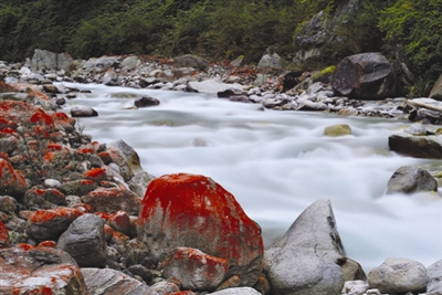 红石滩,常见于四川西部、云南北部、西藏东南部和南部,地点通常是有冰川融水汇集的河床中,海拔高度一般在2000——4000米之间。川西是红石分布最广、数量最多、靓丽程度最高的地区。据中科院研究发现:红石表面所覆盖的红色生物是一种气生丝状绿藻——约利橘色藻。此藻喜欢低温环境,最适宜温度是20°C以下。石头上鲜艳的血红色是因为这种藻的细胞内含有大量类胡萝卜素,如虾青素和β—胡萝卜素等。泥石流或人工造成的新鲜石头最易附着橘色藻类而形成红石滩,环境稳定一段时间后就会被其他植物群落代替。与丹霞类红石相反,阳光下红石滩色泽鲜艳,淋雨后色泽逐渐退色变暗。